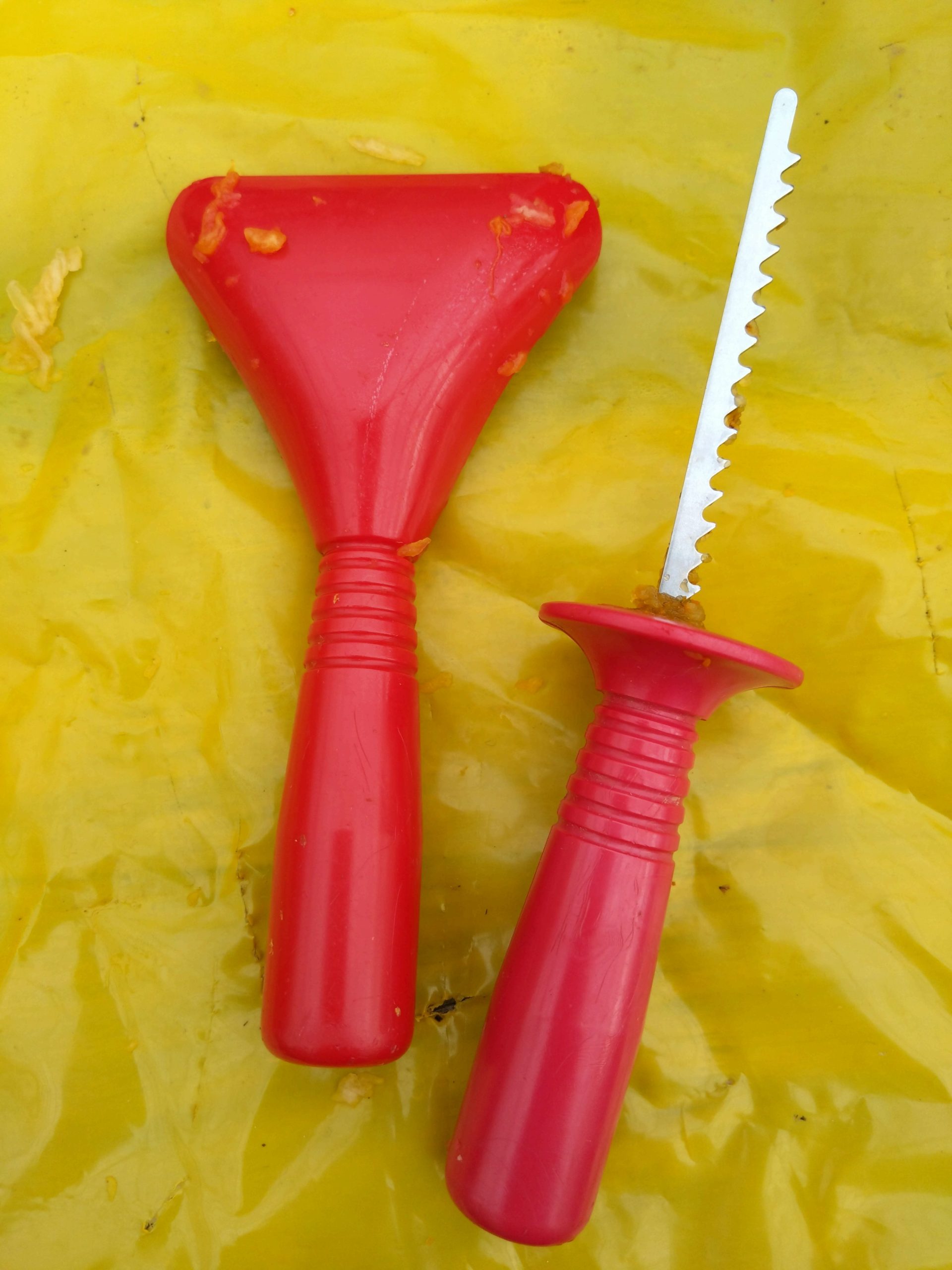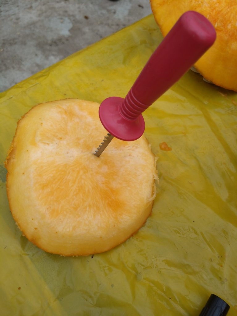 Der erste Arbeitsschritt war eine Reinigung mit Wasser, damit die Erdreste vom Kürbis entfernt werden konnten und diese beim Schneiden nicht stören und sich nicht überallhin verteilen. Danach wurde der Deckel rausgeschnitten, aber Vorsicht: Immer etwas schräg nach Innen schneiden, damit später der Deckel auch auf dem ausgehöhlten Kürbis liegen bleibt und nicht ins Innere hineinfällt.