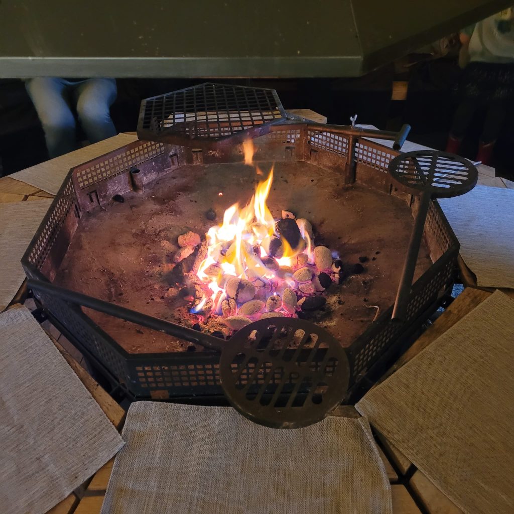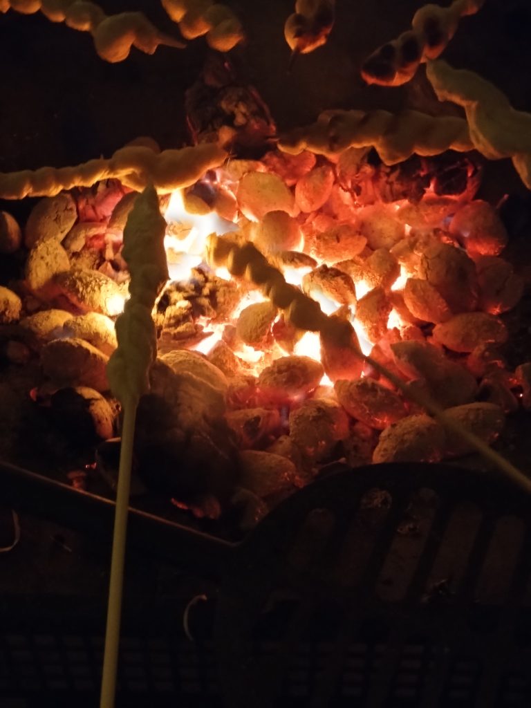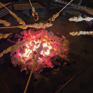 Drinnen ist rundherum eine Bank und in der Mitte eine Feuerstelle mit Abzug, hier erhielt jeder einen Stock, umwickelt mit einem leckerem Teig um selbst das Stockbrot über dem Feuer zu backen.