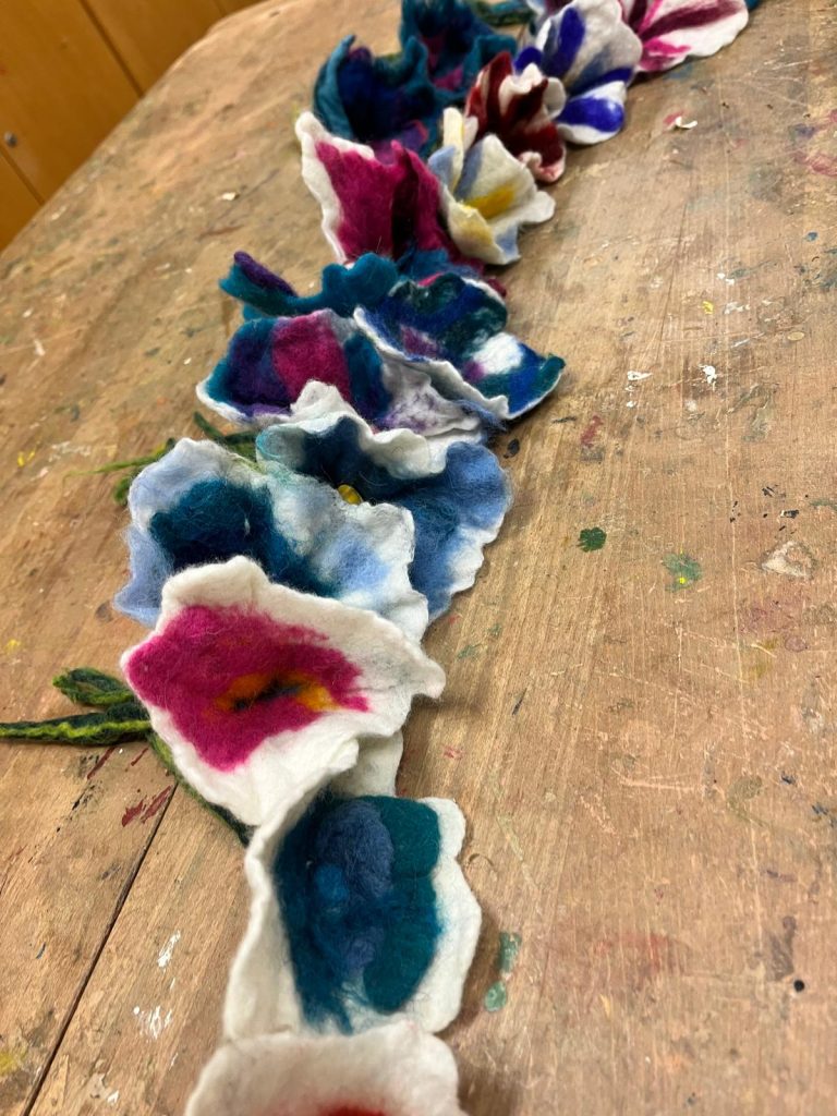Am ersten Termin, kurz vor dem Valentinstag, wurden wunderschöne Blumen gefilzt. Beim zweiten Treffen hatten die Kinder dann die Wahl zwischen weiteren Blumenkreationen und farbenfrohen Freundschaftsarmbändern. Die Ergebnisse waren wie immer großartig! Aufgrund der durchweg positiven Resonanz werden wir das Filzen im nächsten Jahr definitiv wieder in unser Programm aufnehmen.