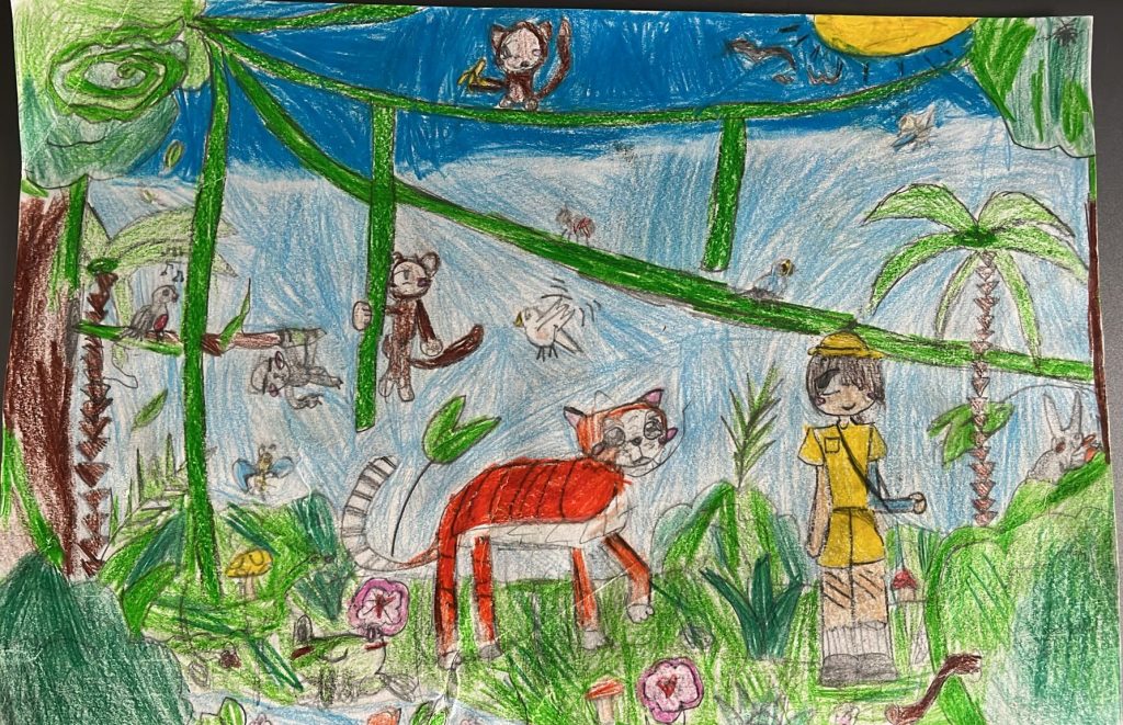 Wie jedes Jahr benötigt der Schulverein ein Titelbild für den Schulplaner. Dafür wurden dies Jahr alle Schüler und Schülerinnen der dritten Klasse aufgerufen, ein Bild zum Thema Dschungel zu malen. Sie hatten Zeit bis zum 13.02.2026 ihr Bild abzugeben. Es gab eine rege Beteiligung und drei Bilder schafften es in die finale Bewertungsrunde, diese Künstler bekamen jeder einen Gutschein von Thalia sowie einen Legami Stift. Am 13.03. wurde das Siegerbild bekannt gegeben und es sieht so aus: